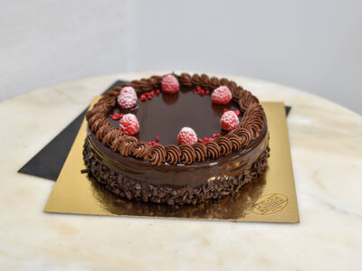 Bizcocho de sacher de cacao relleno de trufa de chocolate y un coulis ligero de frambuesa