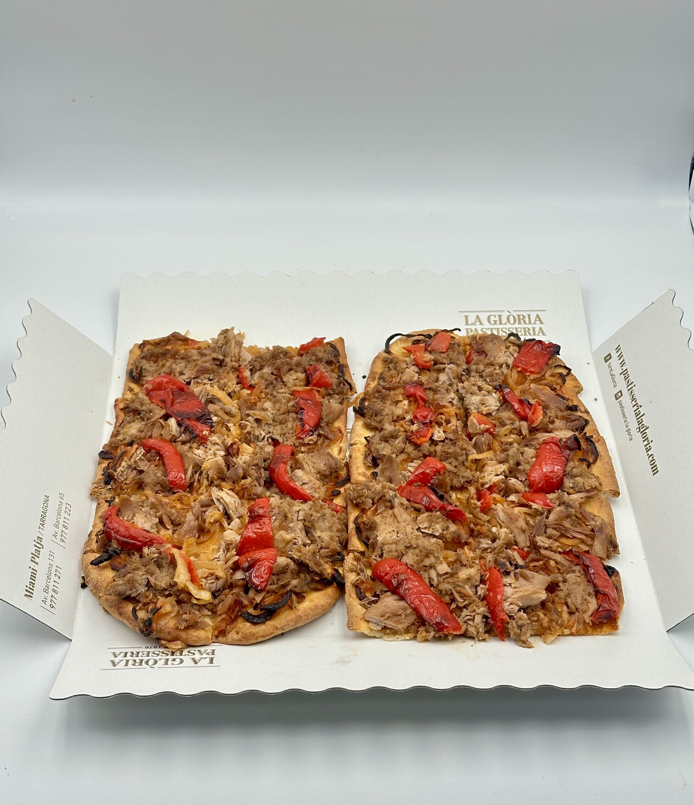 Coca de recapte de cebolla, pimiento rojo con salchicha opcional, cortada o sin cortar