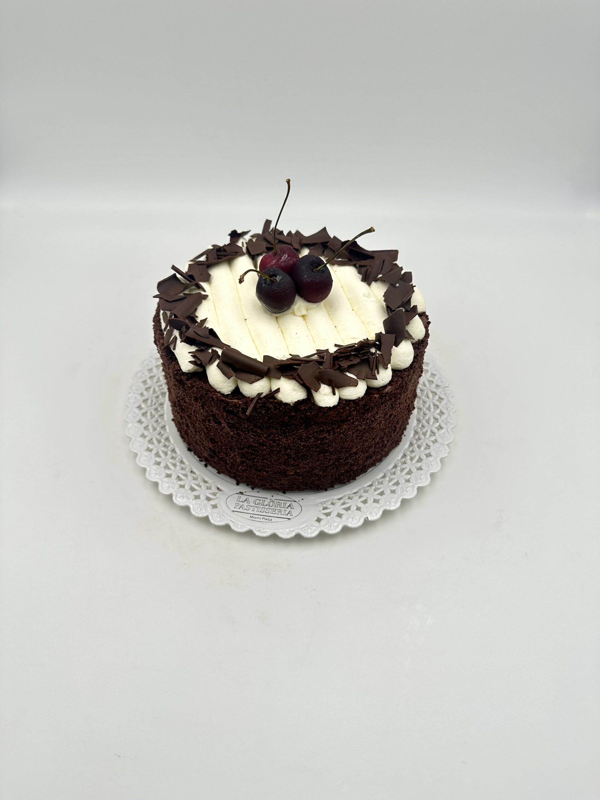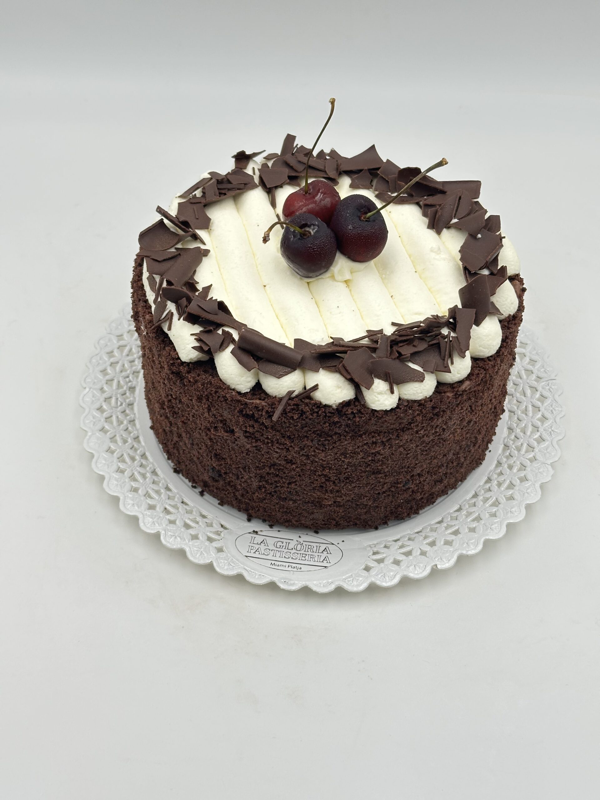 Pastel con bizcocho de chocolate con un ligero punto de jarabe de cereza, crema de mascarpone y chocolate con confit de cereza natural
